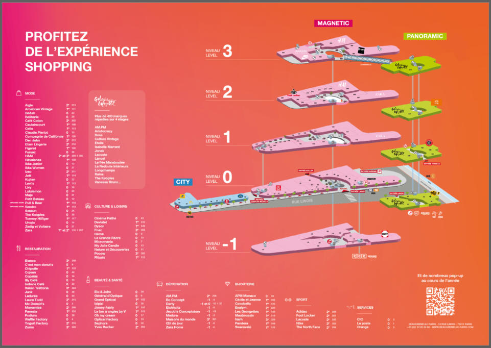 A ADIDAS AIGLE AMPM APM Monaco B BA&SH BALIBARIS BO CONCEPT C C'EST MON DONUTS CAFE COTON CECILE ET JEANNE CELIO CHIPOTLE CIC CINÉMA CLAUDIE PIERLOT COCOBELLO COJEAN COMPAGNIE DE CALIFORNIE COPAINS D DARTY DEVIALET DYSON E EICHHOLTZ ENAYIM ETAM LINGERIE F FIGARET FNAC FOOT LOCKER G GALERIES LAFAYETTE GRAND OPTICAL H H&M HARCOURT HEMA HOMER LOBSTER I ILLY CAFE INDIANA ITALIAN TRATTORIA IZAC J Jacob's Concepstore JIMMY FAIRLY JONAK JOTT JUNK K KRISPY KREME KUJTEN